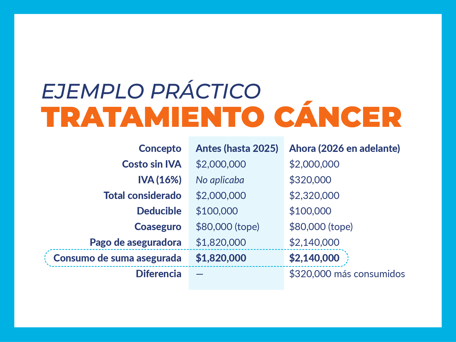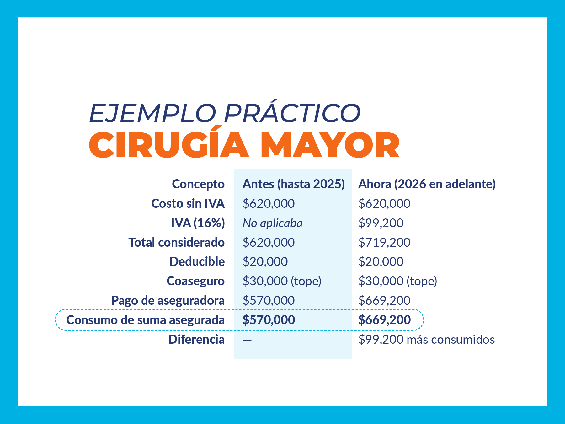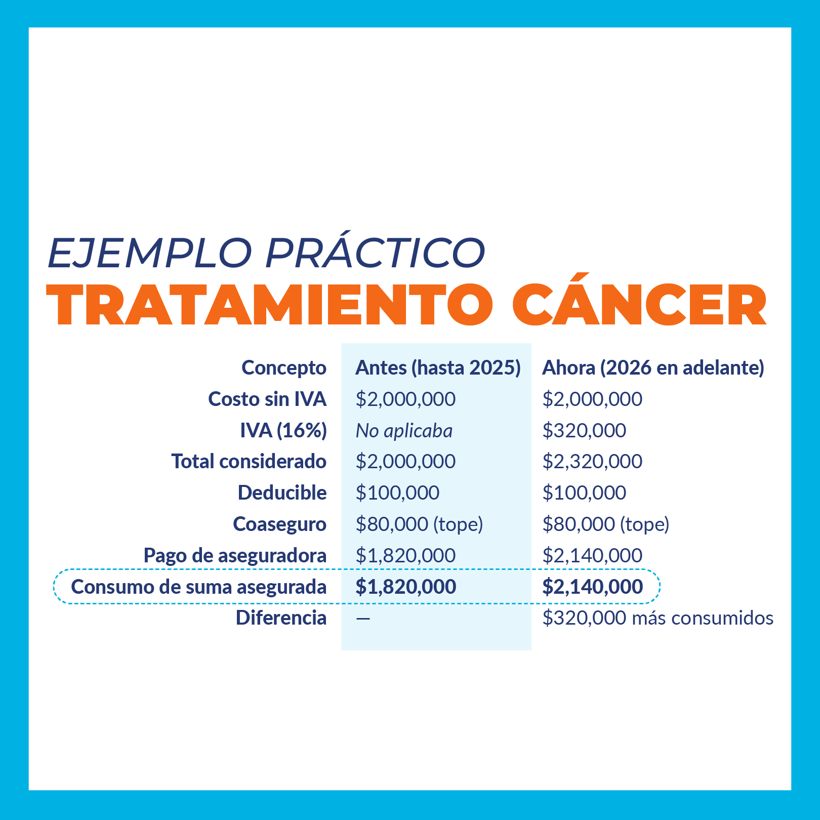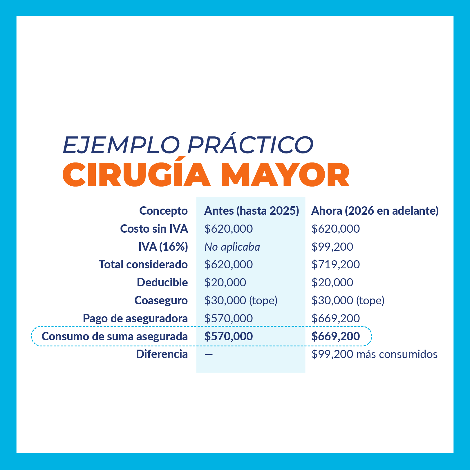 Para entender mejor cómo este cambio afecta la suma asegurada, veamos dos casos comunes: una cirugía mayor u el tratamiento de cáncer. En ambos, el costo sin IVA del tratamiento o reparación es el mismo, pero a partir de 2026 el IVA del 16% también se cuenta dentro del monto del siniestro, reduciendo el saldo disponible de la cobertura.